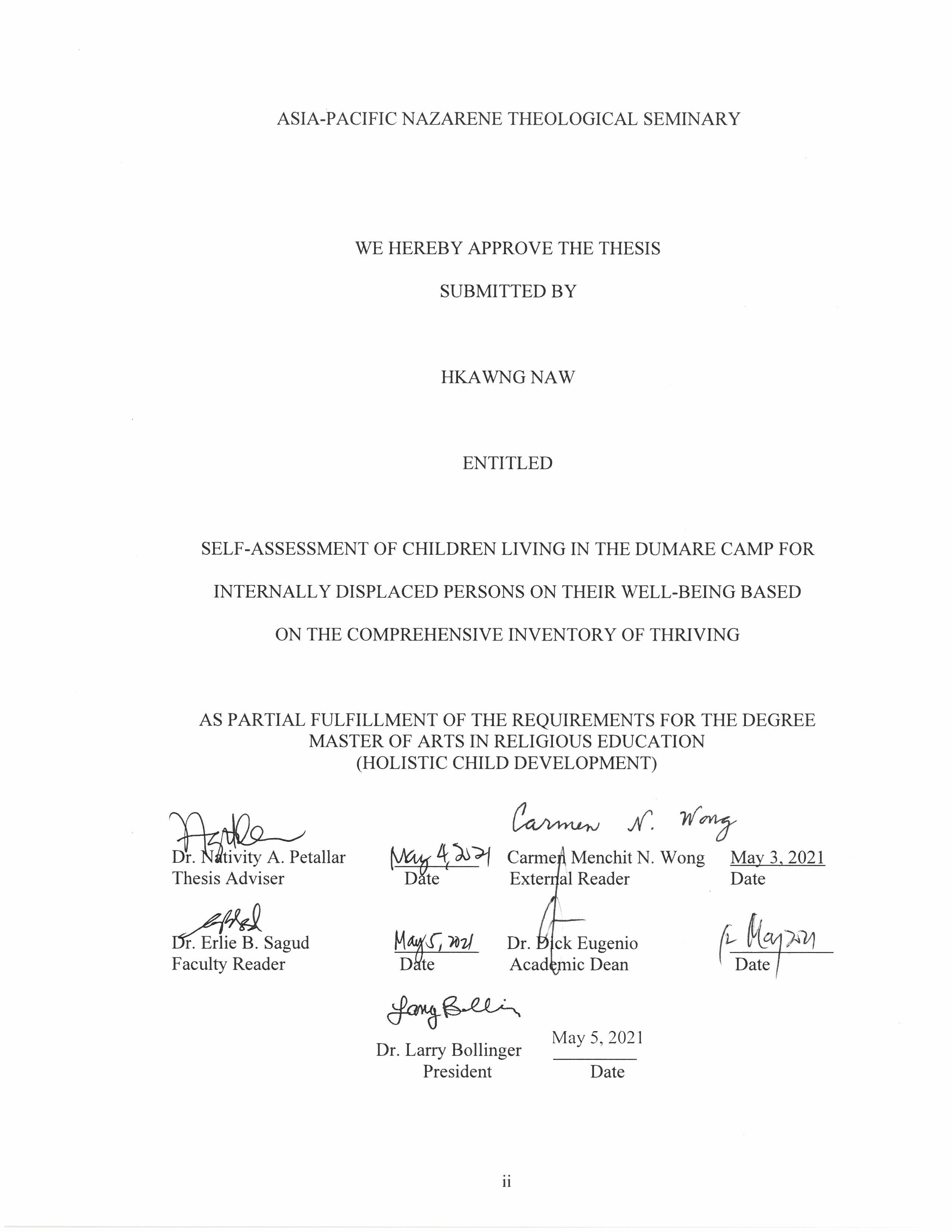 The thesis explores how the selected children in the Dumare camp for Internally Displaced Persons in Kachin State, Myanmar assess their well-being based on the Comprehensive Inventory of Thriving for Children (CIT-Child). This approach is one of the ways where children’s voices are heard to improve the ministry services in this camp. The respondents of the study are 33 children who are between 8 and 18 years old and who have lived in the Dumare IDP camp for six years and above, five of whom participated in interviews via Zoom. The researcher employed mixed methodologies to treat the data gathered, namely, semi-structured interviews and the survey using the CIT-Child questionnaire adapted from Andolfi, Tay, Confalonieri, and Traficante (2017). The data from the interviews were integrated with the related literature and studies as well as from the statistical treatment of the survey findings. T-Test was used to establish the relationships between demographic variables and the dimensions of Child Thriving. The findings of the study revealed that there are no significant differences in the assessments of the selected children when they are grouped according to age and gender against the five dimensions of Child Thriving. The five dimensions are relationship, engagement, mastery, optimism, and subjective well-being. The qualitative responses of the selected children provided some understandings on how the children rated their agreement or disagreement with the statements for each dimension of child thriving. Some of the salient findings include: (1) Children need the support of the people around them. They have identified that God, the church, their family, their friends, the staff of the DIDP, the Non-Government Organizations, and their community are important to them. This reflected what Bronfenbrenner espoused in his Ecological Systems Theory, that is, that these systems have continuing impacts on an individual’s development (Bronfenbrenner 1999); (2) the activities that they engage in at the camp provide them with mastery and help develop their self-worth; (3) some of these children feel lonely and have some “negative feelings” and they have identified the reasons behind these felt needs. Based on the findings of the research, recommendations were identified for the parents, for the staff of the DIDP camp, and for further studies. Listening to the children who have lived in this camp has led to some specific recommendations as to how the ministries in the camp and in the homes can be improved so these children thrive in all the dimensions in their lived experiences. The following are some gaps this research study has identified for which there is still a need for further studies: a. mixed-methods evaluative study on the strengths and weaknesses of the Dumare IDP camp with parents as respondents; b. quantitative research on the knowledge, attitude, and practice (KAP) of the parents and staff of the Dumare IDP camp on children’s spirituality; c. holistic analysis of the activities by the Baptist Convention in Myanmar based on the dimensions of child well-being; and d. phenomenological study on the impact of COVID-19 on the well-being of the children in Dumare IDP camp